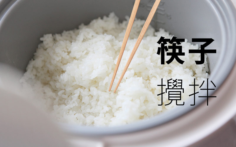 五、攪拌:掀開鍋蓋,用筷子輕輕攪翻白飯,鬆軟。因為電子鍋受熱不均,較熱的地方,飯會容易糊掉,必須用筷子均勻翻攪,讓每個吃飯的人都能享用到米最好的狀態;用飯匙壓容易把飯壓實,糊在一起。